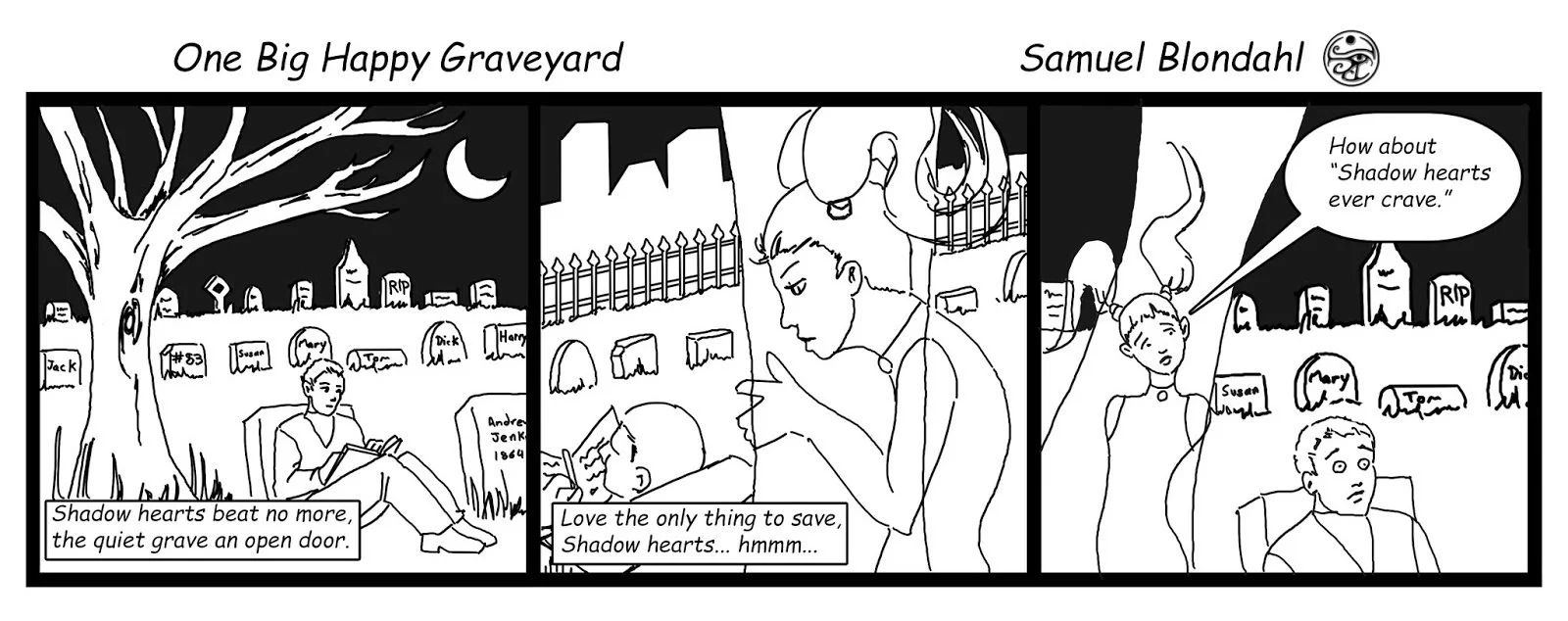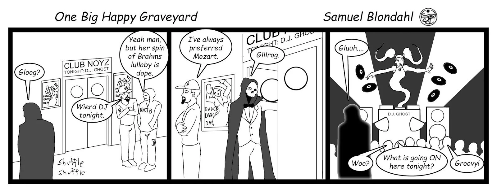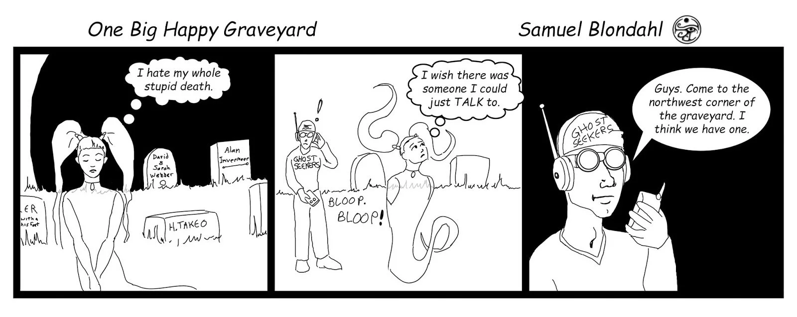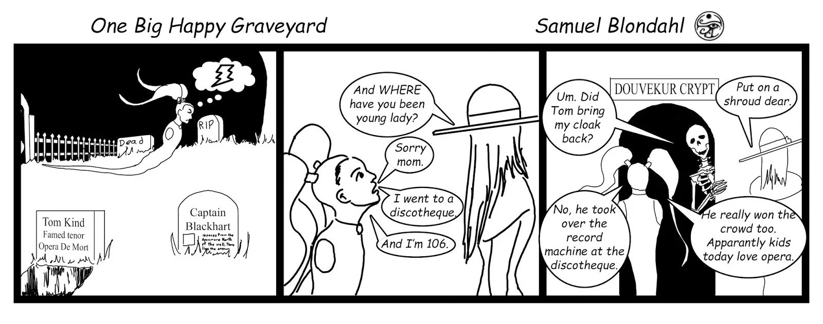 One Big Happy Graveyard is a webcomic I put together a few years ago. I’ve put it up on my website for the Halloween season, and I hope you like it. It’s a little rough, but it always gives me a laugh to look back at. Hit my socials to tell me what you think!